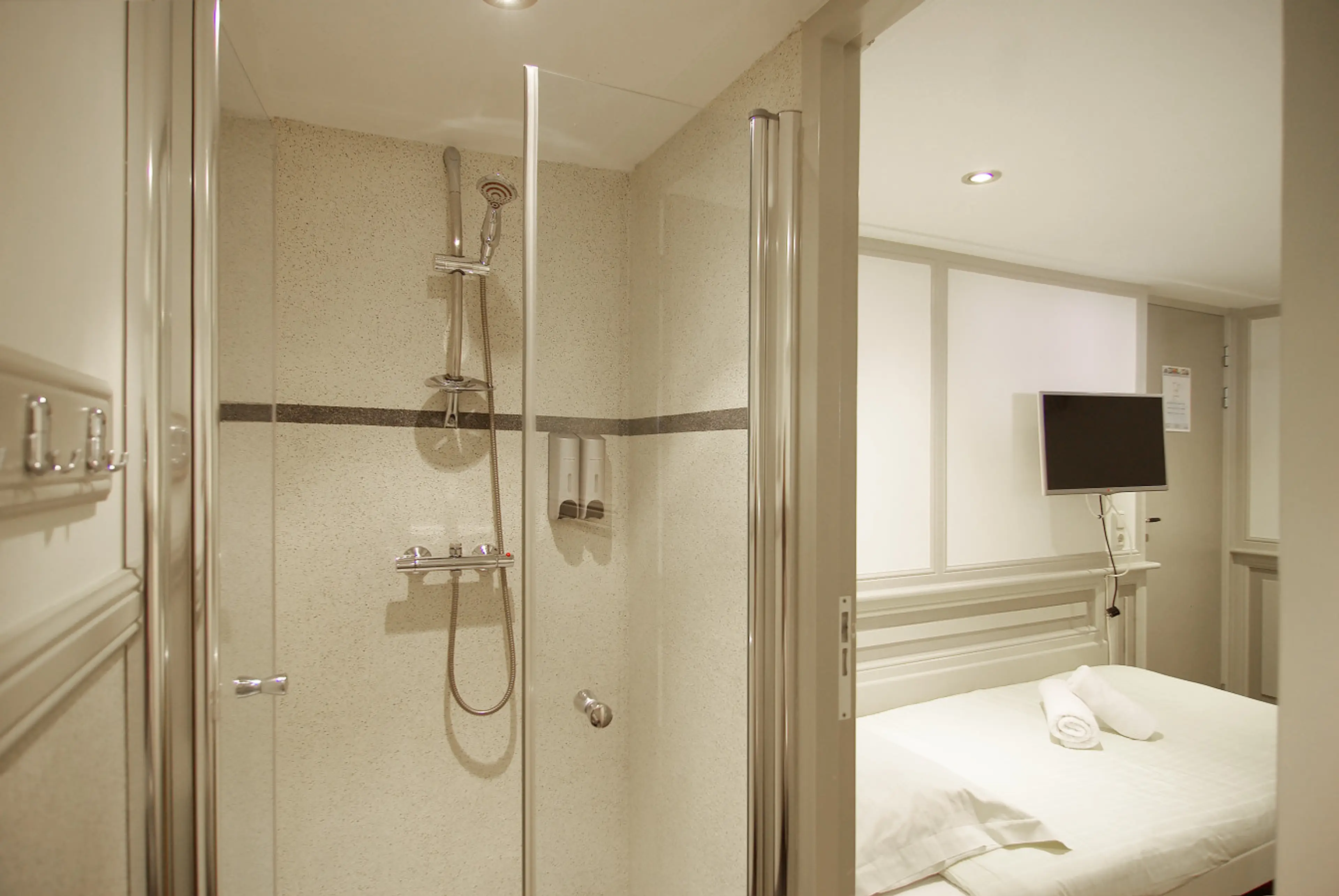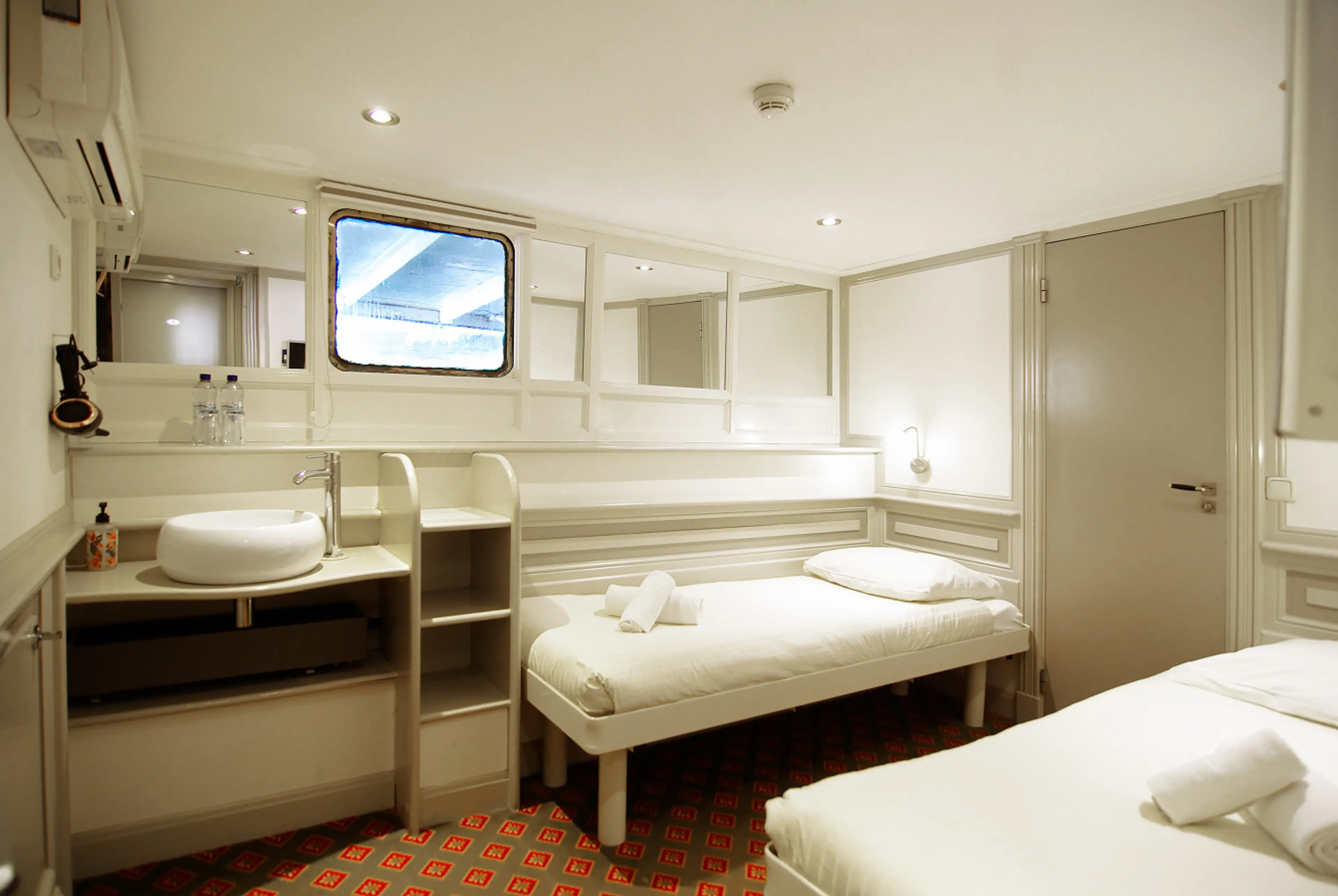 Twin Room – Kapitein Anna This charming twin room aboard the historic hotel ship Kapitein Anna features two separate beds that can be pushed together if desired. The room includes a private bathroom and is decorated in a warm, maritime style that reflects the character of the vessel. Located in Am...